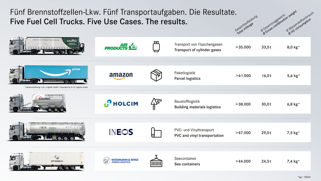 شاحنة دايملر تخطط الآنالجولة الثانية من التجارب على نفس الشاحنة و مجموعة من العملاء الجدد بدأت في الربع الرابع . بحلول نهاية عام 2026 ، المشروع بأكمله سوف تدخل مرحلة جديدة من الإنتاج الضخم . أول العملاء سوف يكون 100 الهيدروجين الجرارات التي سيتم استخدامها بشكل دائم .