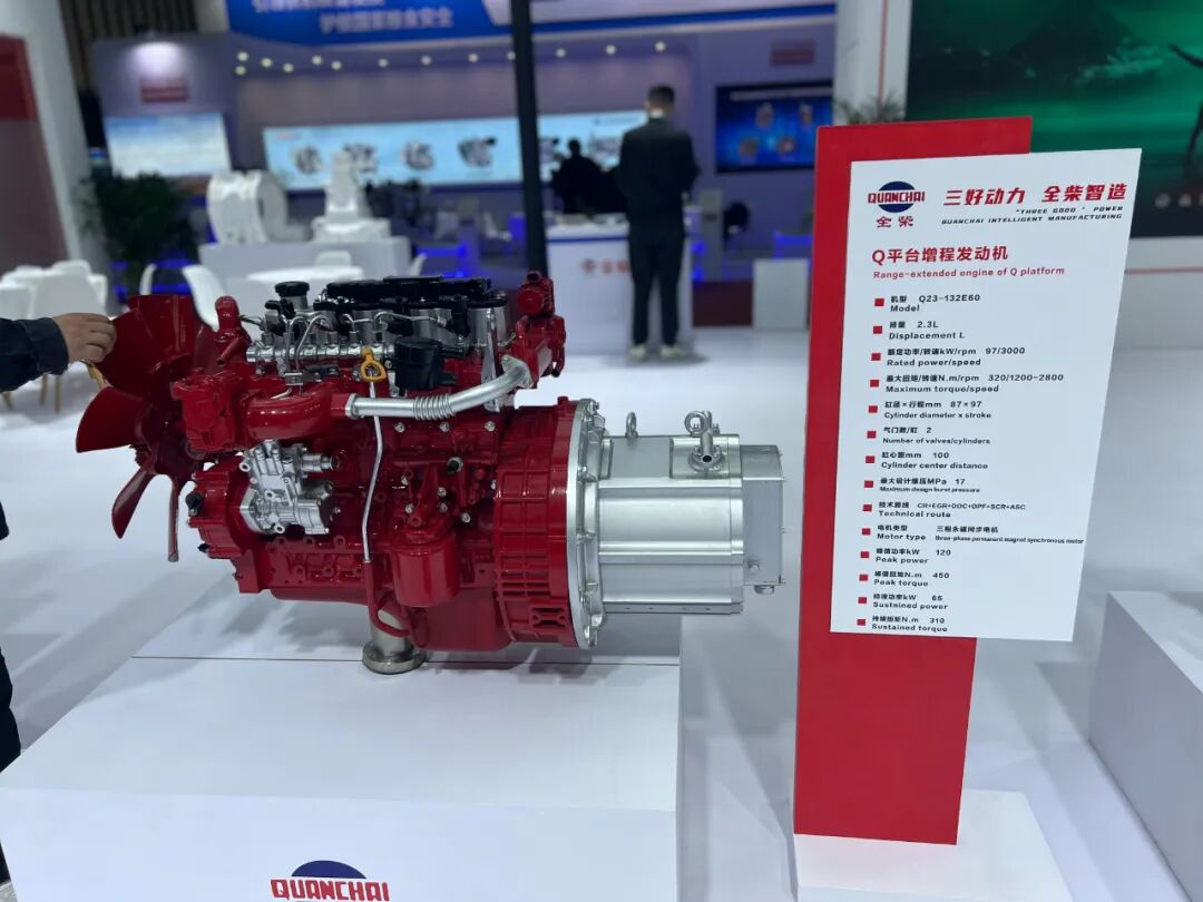 In addition,QThe platform also showcased an extended range engine with displacement2.3L, equipped withCR+EGR+DOC+DPF+SCR+ASCTechnology, equipped with permanent magnet synchronous motor, peak power120kwPeak torquefour hundred and fiftyBull rice, strong power, long range, suitable for new energy light truck products.