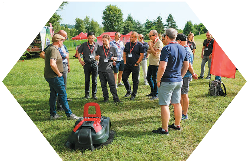 在意大利博洛尼亚举行的经销商会议上,外国客商正围在格力博生产的AiConic智能割草机器人旁观察产品性能。