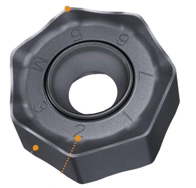 特有的14刃角刀片,可使用双面、低切削阻力双重正角刃型及多刃设计,实现高效加工。同时比以往的刀片更厚支持大进给等高负荷加工。