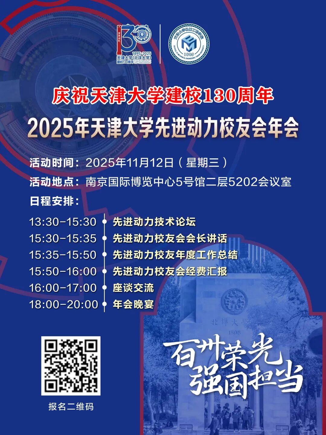 在天津大学建校130周年的荣光时刻,2025年天津大学先进动力校友会年会将于金陵古城-南京盛大启幕。我们诚邀深耕于先进动力领域的您齐聚南京,共叙同窗情谊,共话技术前沿,共绘发展蓝图!