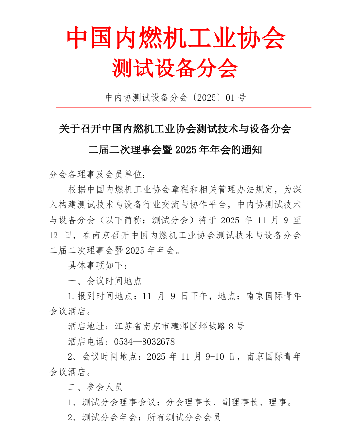 盛会启幕丨中国内燃机工业协会测试技术与设备分会2025年理事会暨会员年会的通知