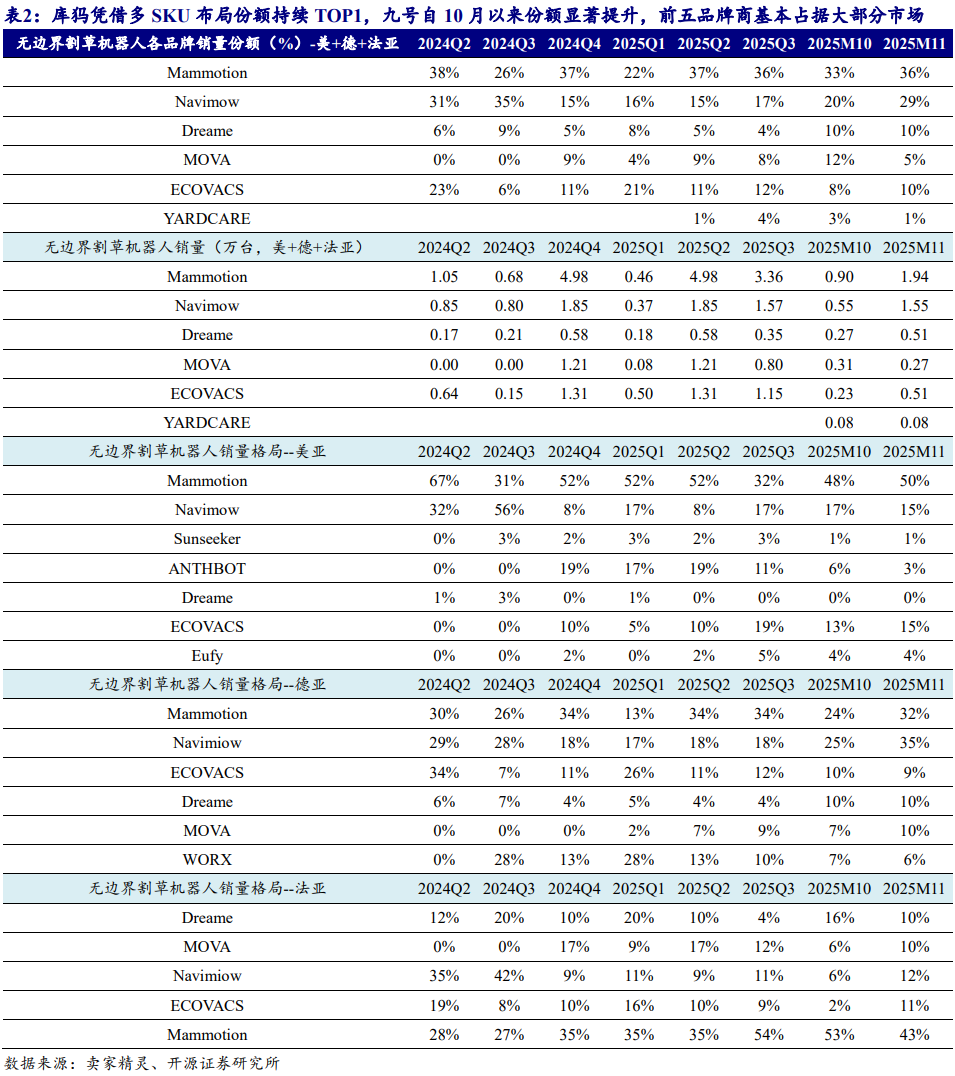 整体:2025Q3/2025M11 库犸份额均超 30%,九号份额分别达 17%/29%, 黑五促销带动九号份额显著提升。其次追觅+MOVA 合计份额分别为 12%/15%,科沃斯份额分别为 12%/10%,前五大品牌商基本占据无边界割草机器人绝大部分市场。