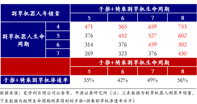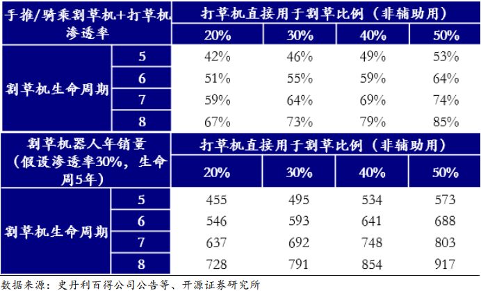 对标手推+骑乘割草机:若割草机器人生命周期更短,则对应年销量 430~753 万台