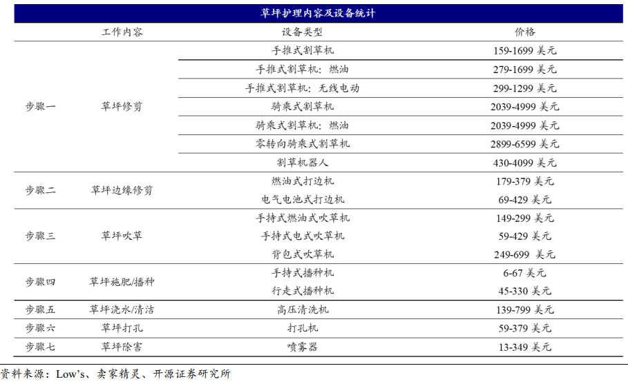 手推+骑乘割草机渗透率测算:按美国 1 亿块,欧洲 8000 万块私人花园测算, 预计欧美割草机渗透率不足50%(类似吸尘器 100%渗透率),系部分人群选人雇人 割草或选择用打草机进行割草。
