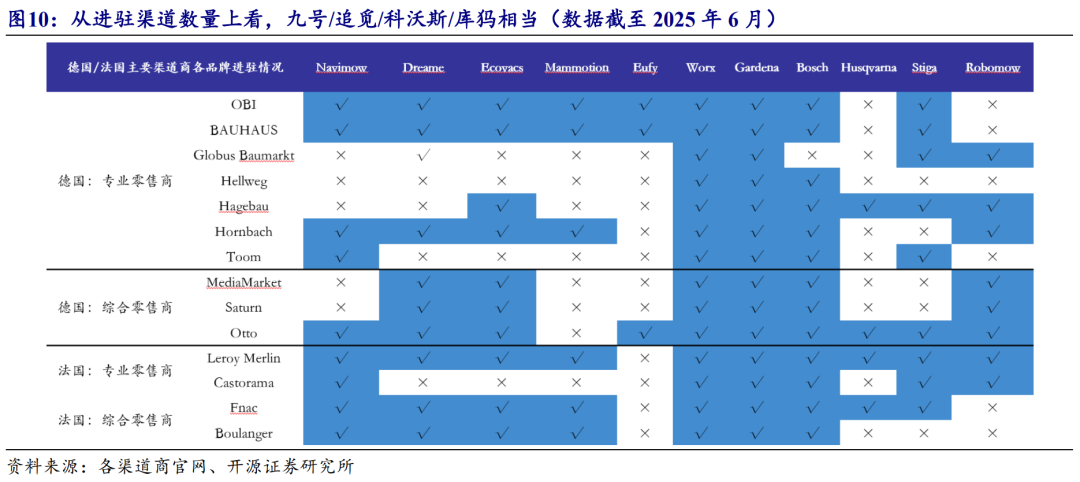 不同于扫地机器人,割草机器人以线下渠道为主,因此单一亚马逊渠道难以反映品牌方竞争力,并且线下渠道强壁垒带来的先发优势也可能会比市场预期要强。目前从进驻渠道数量来看,九号/追觅/科沃斯/库犸基本相当,传统龙头企业富世华/宝时得/博世有绝对数量优势。
