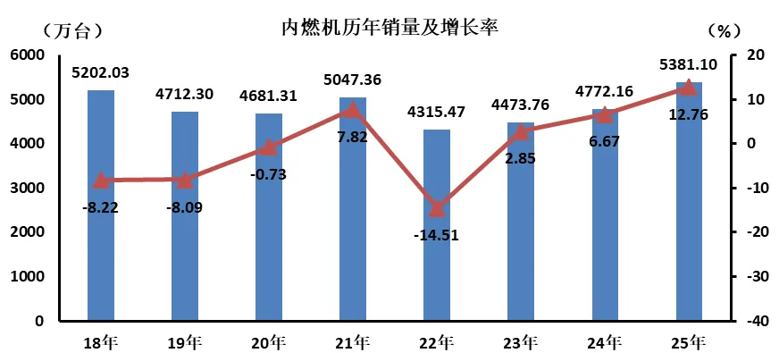 据中国内燃机工业协会统计分析,2025年12月,内燃机行业销量474.54万台,环比增长-1.97%,同比增长0.98%;全年销量5381.10万台,同比增长12.76%。