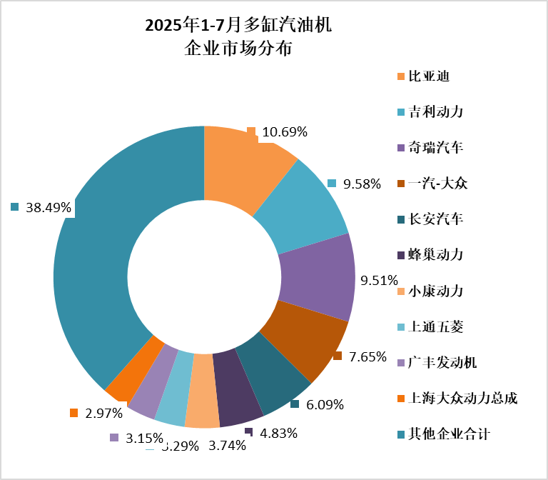 Доля легковых автомобилей, используемых в многоцилиндровых бензиновых двигателях, составила 96,77%, продажи 16,0 млн. штук в июле, рост на 2,13% по сравнению с аналогичным периодом прошлого года, рост на 8,14%; Совокупные продажи в январе - июле составили 10756,9 тыс. штук, увеличившись на 5,04% по сравнению с аналогичным периодом прошлого года. BYD, Geely, Chery, First Automobile - Volkswagen, Changan Automobile Dynamics, Xiaochang Dynamics, Shangtong Wuling, Guangfeng Engine, Shanghai Volkswagen Dynamics в общем объеме продаж занимает первое место