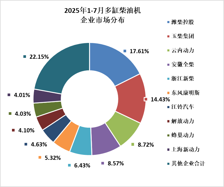 В июле многоцилиндровые дизельные предприятия продали в общей сложности 2892 000 единиц, увеличившись на 12,30% по сравнению с аналогичным периодом прошлого года, увеличившись на 6,14%; Совокупные продажи в январе - июле составили 244,1 тыс. штук, увеличившись на 4,14% по сравнению с аналогичным периодом прошлого года. Вэйчай, Юйчай, Юньнань, Цюаньчай, Синьчай, Дункан, Цзянлин, Jiangling Power, Mobile Power, New Power Technology продаются в первой десятке, что составляет 77,85% от общего объема продаж многоцилиндровых дизельных двигателей; Доля рынка: Вэйчай 17,61%, Юйчай 14,43%, Юньнань 8,72%, все дрова 8,57%, новые дрова 6,43%, Dongkang 5,32%, Jiangling 4,63%, освободительная мощность 4,10%, мощность улья 4,03%, новая энергетическая технология 4,01%.
